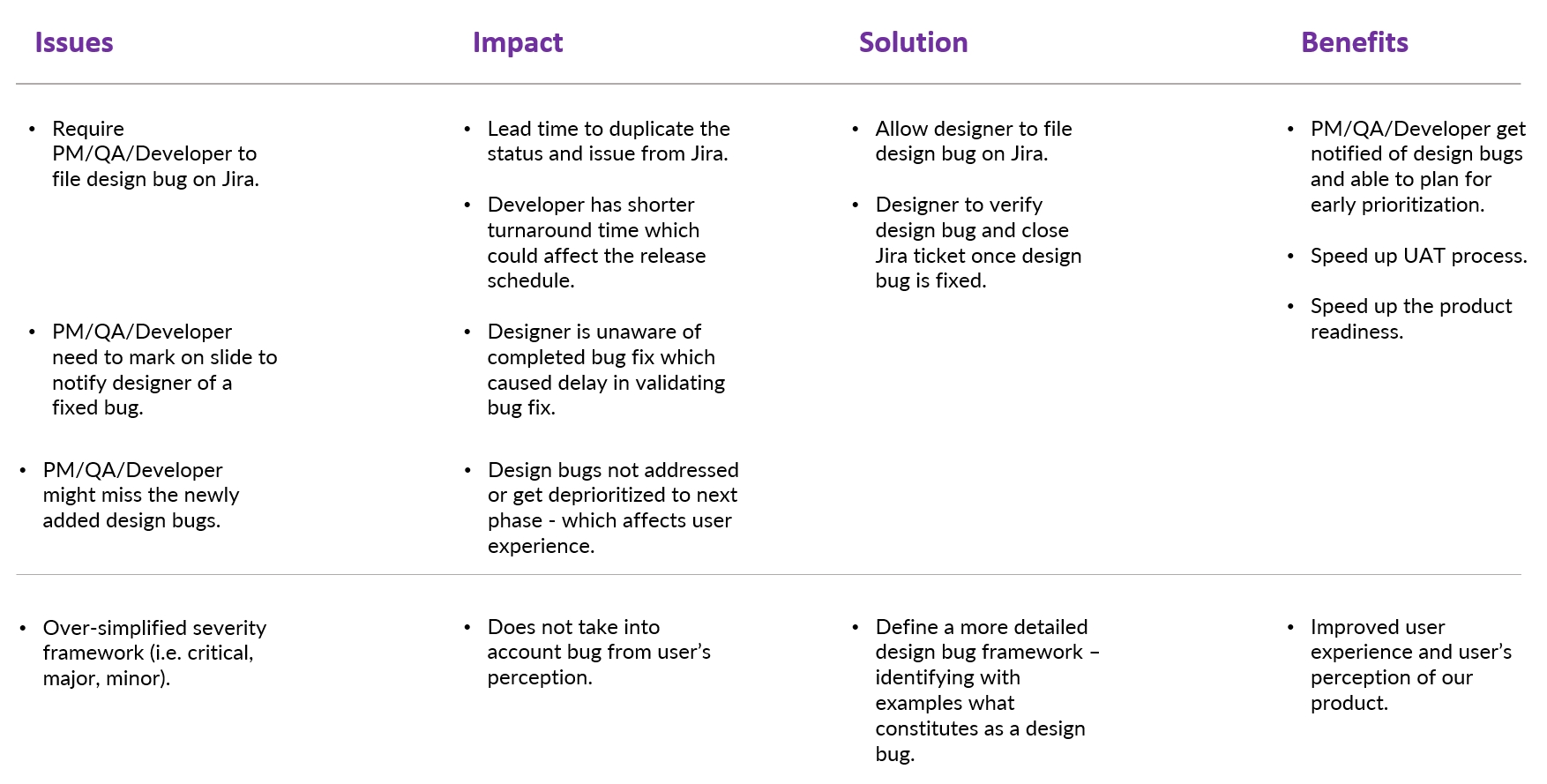 BenefitsDuring design validation, design bugs were previously filed in Powerpoint and Product Manager act as the middleman to communicate bugs to development team. I saw the problem with inefficiencies and proposed a new framework to allow designers to communicate with project team in a single channel.