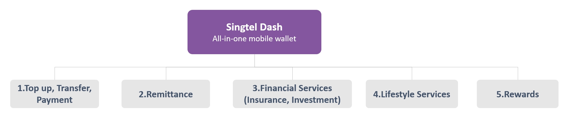 Singtel Dash is an all-in-one mobile wallet that lets customers pay, remit, save and insure in one app. It covers a spectrum of offerings and the product is segmented into different business functions.