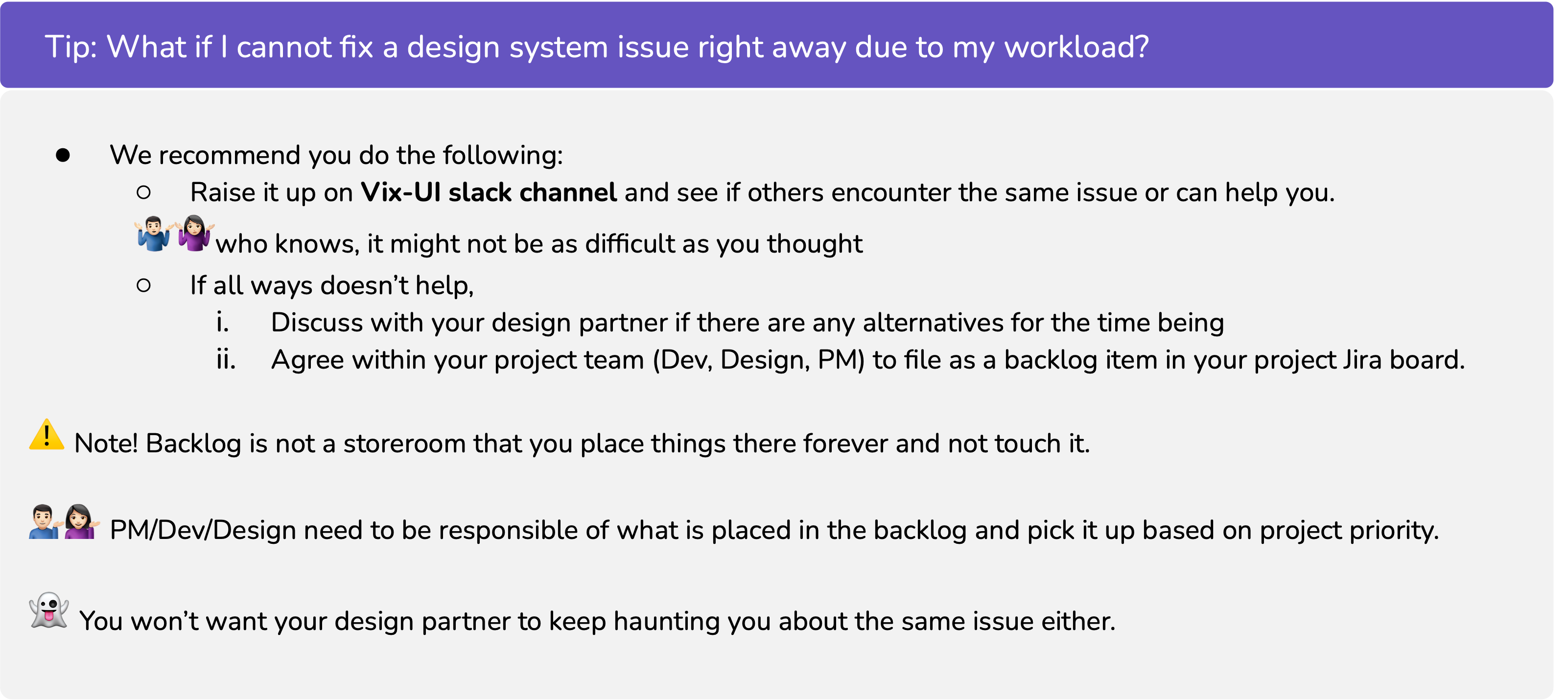 When validating an application, there might be a design system bug found. I came up with this process to help developers and designers know what to do: