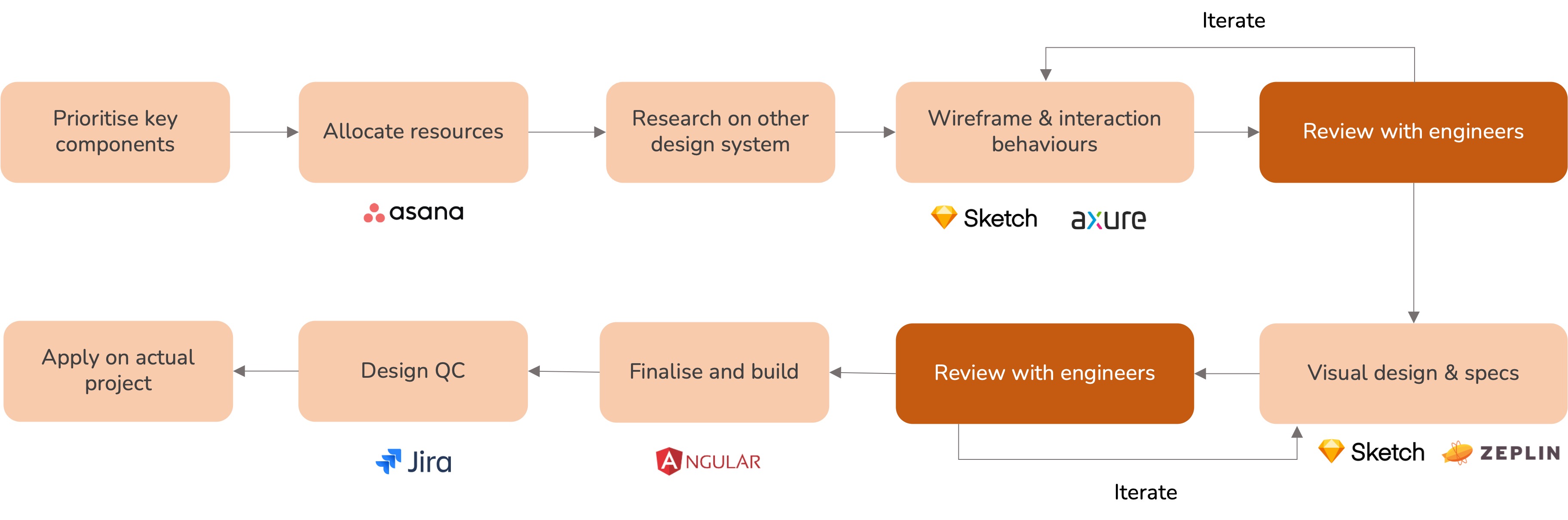 Once a component is implemented, designers will conduct Design QC to validate against the design specifications. When a component is ready to be used, it is applied to actual project to identify technical gaps and design changes required. This process is iterative and enhancements were raised as we design more UI screens.