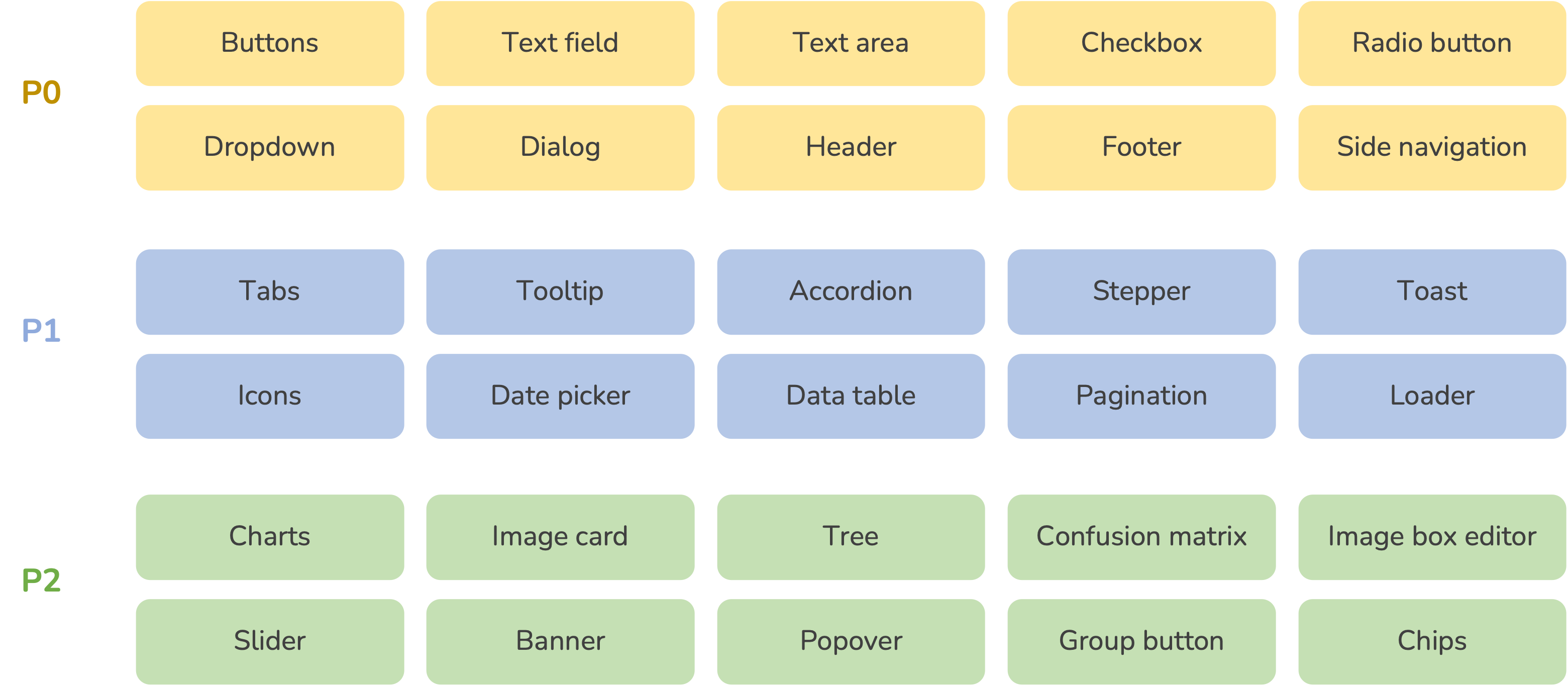 First and foremost, I worked with the engineers to prioritise UI components by evaluating all web applications and identify commonalities. Group UI components into P0, P1 and P2 (P0 being most important and commonly used in most use cases and P2 being least important for the time being until more use cases are found).